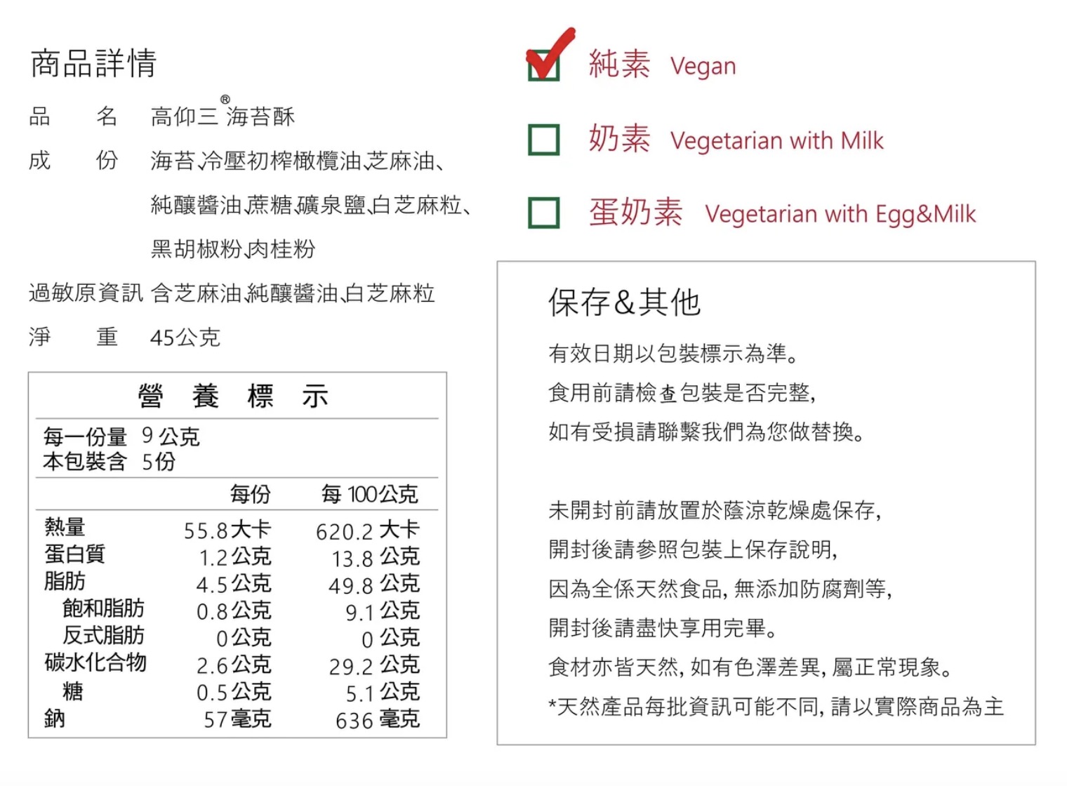 ◆容量/規格: 海苔酥 / 45公克